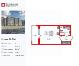 Удобная, классическая, функциональная европланировка, вместительная прихожая 3.05 м². Общая площадь студии - 21.76 м², жилая 15.4 м², высота потолка 2.77 м.