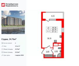 Удобная, классическая, функциональная европланировка, вместительная прихожая 3.05 м². Общая площадь студии - 24.76 м², жилая 18.16 м², высота потолка 2.77 м.