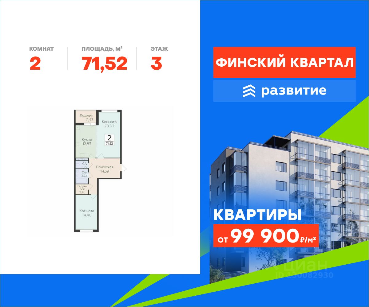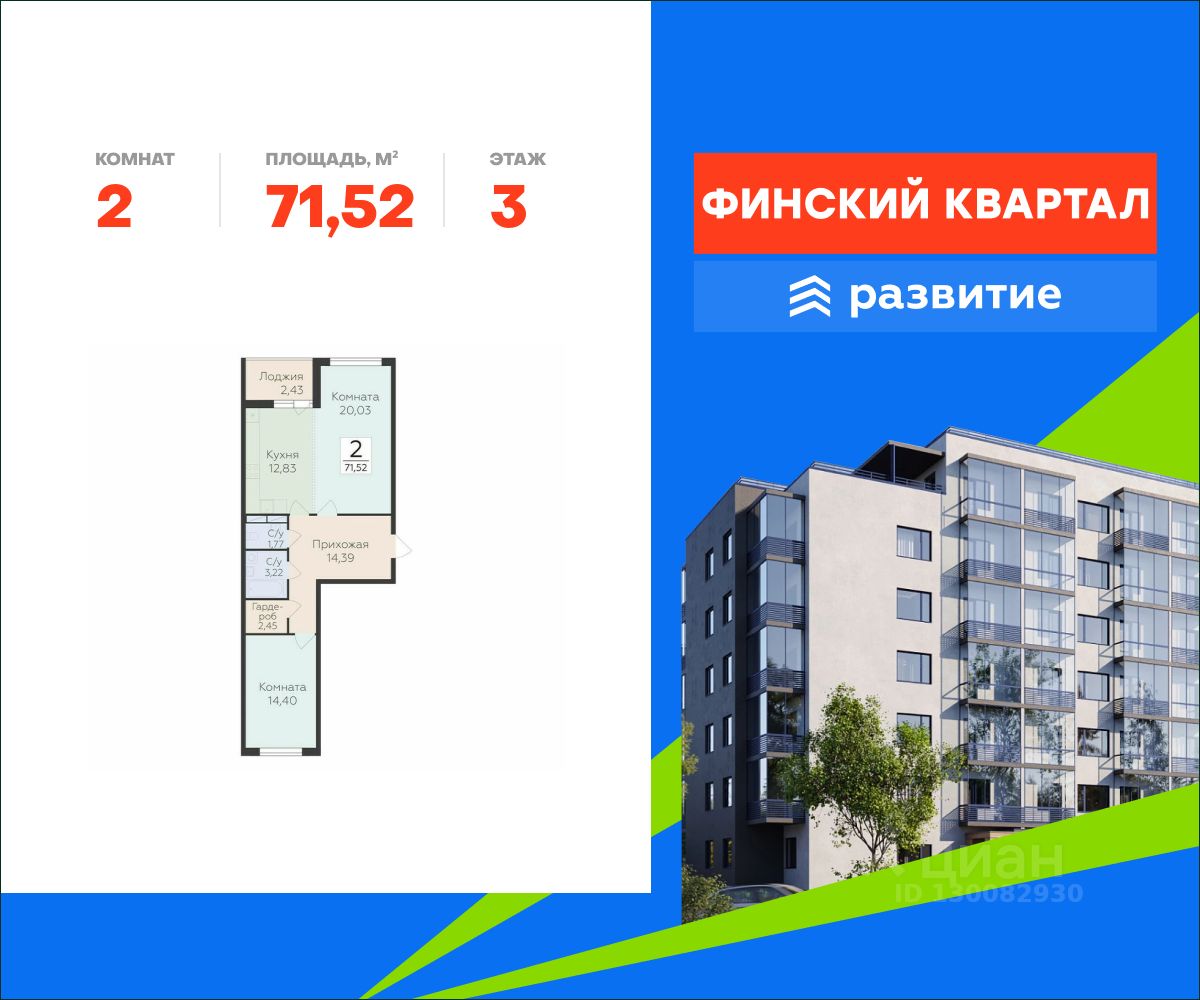 Продается квартира площадью 71.52 кв. м без отделки. Квартира расположена на 3 этаже 8 этажного дома, в жилом комплексе комфорт-класса "Финский Квартал".