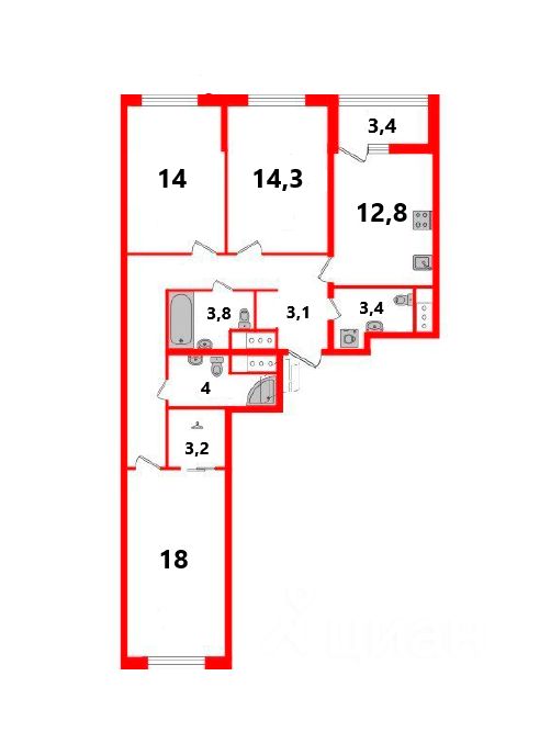Комнаты все изолированные, предусмотрены 3 сан. узла.