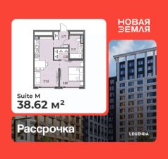 Просторная 1-комн. квартира с предчистовой отделкой в ЖК "Новая Земля" на 4 этаже. Общая площадь: 38.62 кв.м., жилая: 9.99 кв.м., площадь просторной кухни-столовой: 17.23 кв.м. Все окна выходят на одну сторону. В квартире один совмещенный санузел. Высота потолков 2.85 м.