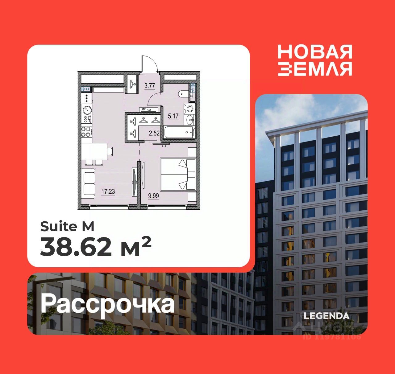 Однокомнатная квартира с предчистовой отделкой в ЖК "Новая Земля" на 14 этаже. Общая площадь: 38.62 кв.м., жилая: 9.99 кв.м., площадь просторной кухни-столовой: 17.23 кв.м. Все окна выходят на одну сторону. В квартире один совмещенный санузел. Высота потолков 2.85 м.