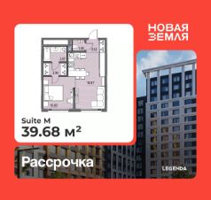 1-комн. квартира с предчистовой отделкой в ЖК "Новая Земля" на 10 этаже. Общая площадь: 39.68 кв.м., жилая: 10 кв.м., площадь просторной кухни-столовой: 18.87 кв.м. Все окна выходят на одну сторону. В квартире один раздельный санузел. Высота потолков 2.85 м.