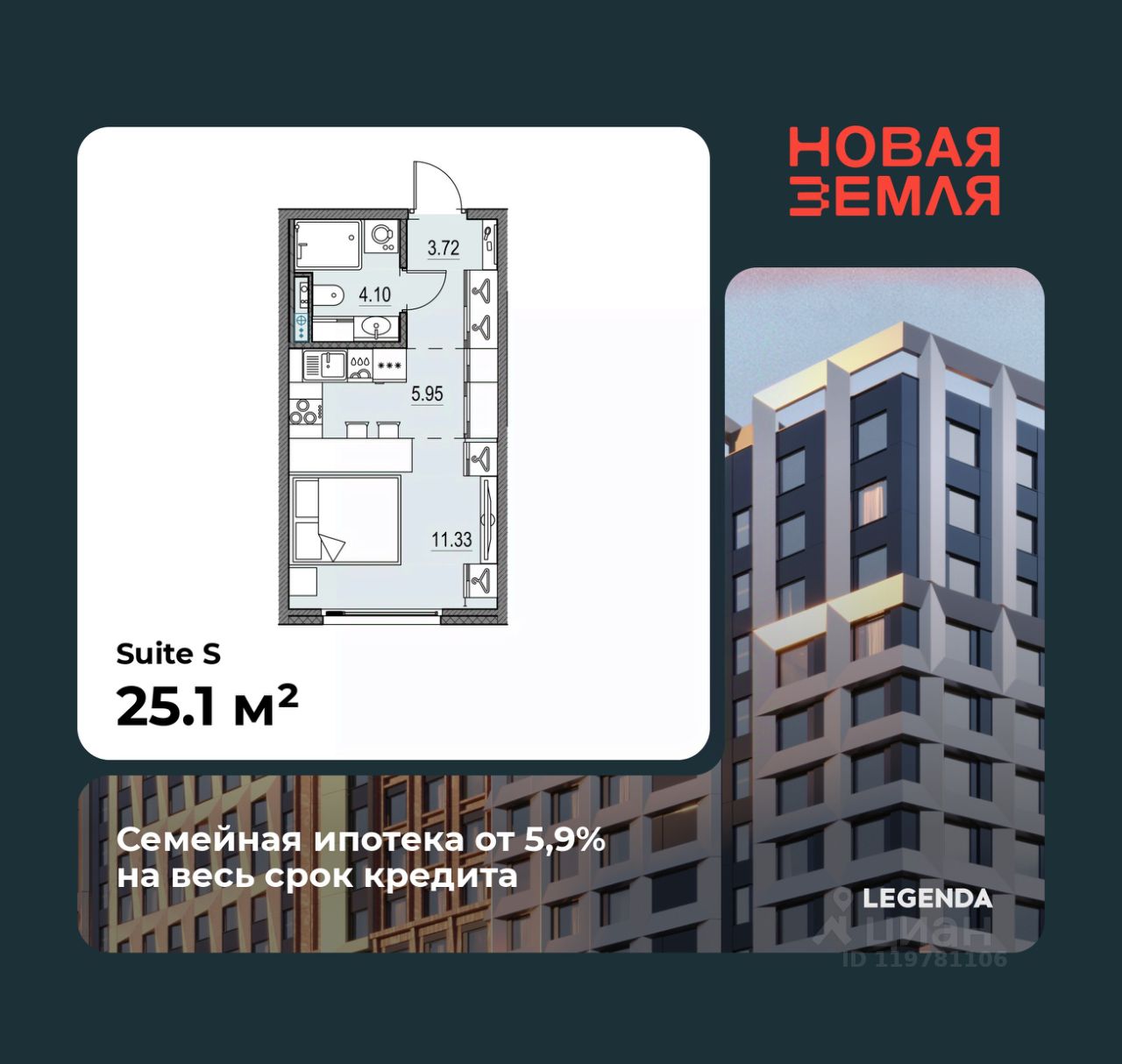 Продается однокомнатная квартира-студия с предчистовой отделкой в ЖК "Новая Земля" на 4 этаже. Общая площадь: 25.1 кв.м., площадь гостиной 17.28 кв.м., из которых 5.95 кв.м. выделено под кухонную зону. Все окна выходят на одну сторону. В квартире один совмещенный санузел. Высота потолков 2.85 м.