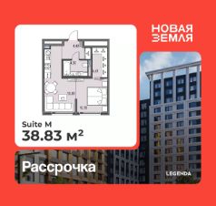 Просторная 1-комн. квартира с предчистовой отделкой в ЖК "Новая Земля" на 9 этаже. Общая площадь: 38.83 кв.м., жилая: 10.16 кв.м., площадь просторной кухни-столовой: 15.55 кв.м. Все окна выходят на одну сторону. В квартире один совмещенный санузел. Высота потолков 2.85 м.