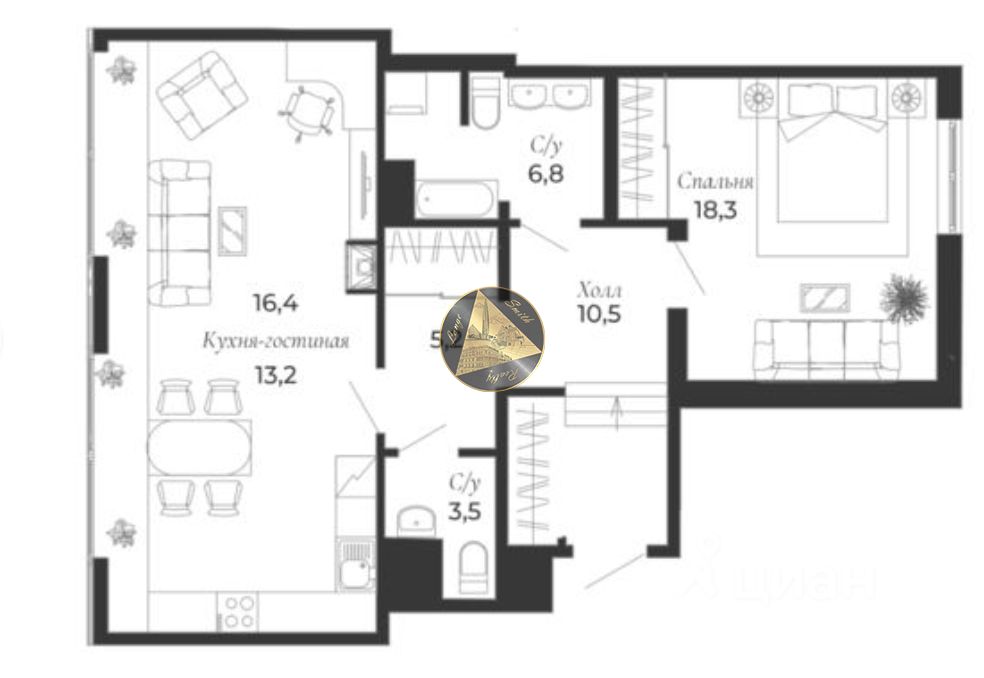 Квартира находится на 6 / 6 этаже. Общая площадь квартиры 73,9 м2. Кухня 29,6 м2. Спальня 18,3 м2. Санузел: 6,8 + 3,5 м2