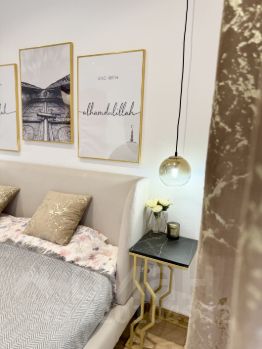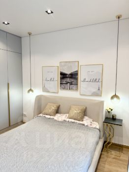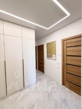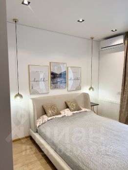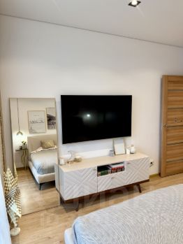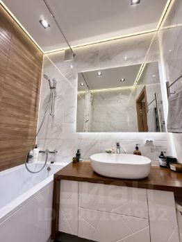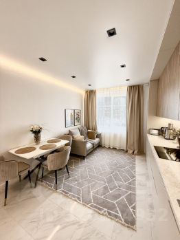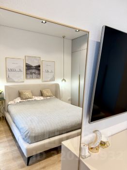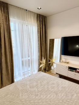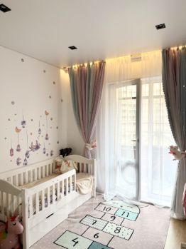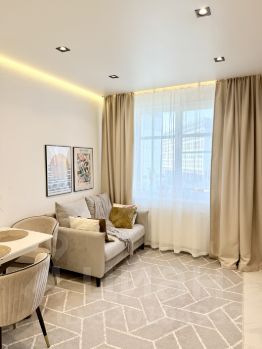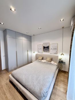 В квартире сделаны парящие натяжные потолки с теневым профилем EuroKraab, скрытыми карнизами и LED подсветкой. В спальне установлена сплит-система.