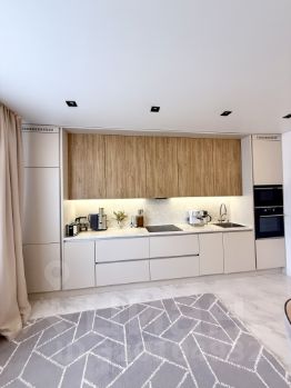 Кухня-гостиная: встроенный холодильник LG, индукционная варочная панель и духовой шкаф Electrolux, встроенная микроволновая печь Hansa, посудомоечная машина Beko. Под мойкой установлен измельчитель отходов Zorg, фильтр для питьевой воды.