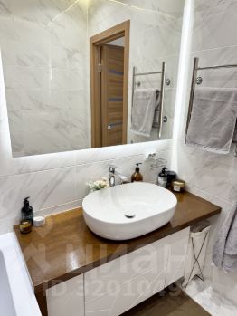 В ванной комнате установлена качественная сантехника AM.PM, Grohe, столешница под раковину выполнена из натурального дуба.