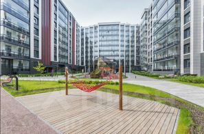 - Под территорией — отапливаемый паркинг с охраной. Подземная стоянка рассчитана на 692 машиноместа, еще 84 автомобиля жители смогут оставить на парковке под открытым небом.