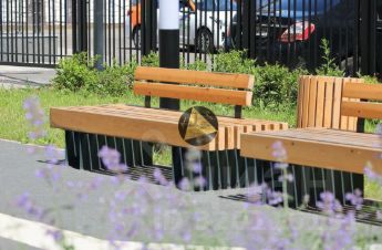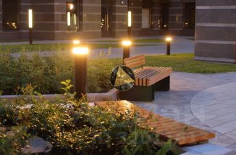 4) На территории две площади с фонтанами, цветниками и скамейками. В глубине двора детские и спортивные зоны, площадка для игры петанк.