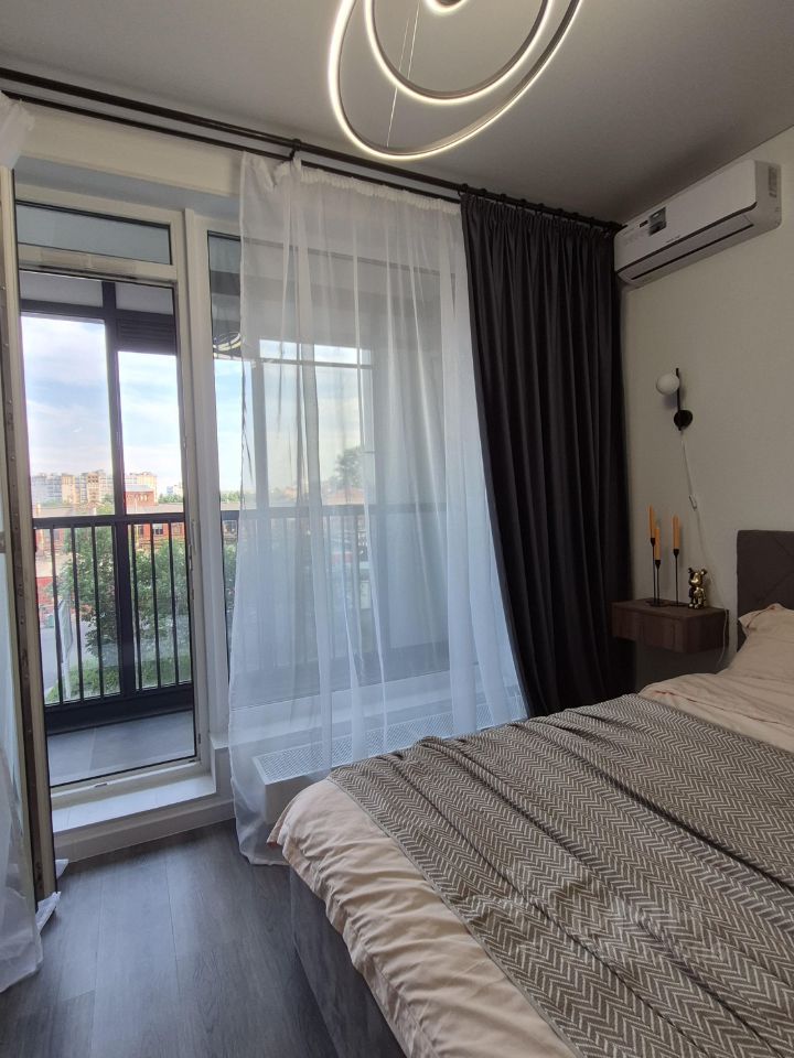 В квартире выполнен дизайнерский ремонт, что создает стильную и современную атмосферу. Кухонный гарнитур выполнен под заказ, есть вся необходимая встроенная техника: варочная панель, вытяжка, посудомоечная машинк. В квартире установлен кондиционер. Работает как на охлаждение, так и на прогревание квартиры. В ванной душевая кабина и стиральная машинка, установлен пол с подогревом. Температуру можно регулировать. Планировка студии продумана до мелочей, что позволяет максимально эффективно использовать пространство. Удобная двуспальная кровать с ортопедическим матрасом. Есть зона кухни, комод, туалетный столик, можно использовать, как рабочую зону. Есть большой и вместительный шифонер. В квартире есть огромная лоджия, где можно посидеть и попить кофейку. Установлены панорамные окна в квартире и лоджии, что добавляет света и пространства.Окна на южную сторону, поэтому в квартире светло и солнечно. В дому установлена система: " Умный дом". Счетчики воды и света подаютмя автоматически, камеры наблюдения во дворе, возле подъезда, на парковке. Все сделано с любовью.и заботой. Въезд на территорию комплекса через шлагбаум, есть охрана. Для детей прекрасные детские площадки, закрытая территория.