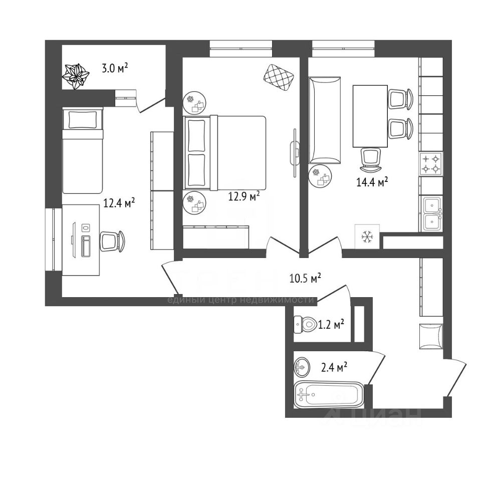 Квартира расположена на 9 этаже 19-этажного кирпично-монолитного дома, построенного в 2019 году. Общая площадь квартиры составляет 54,1 кв. м, из которых 25,3 кв. м — жилая площадь. Две изолированные комнаты (12,4 кв. м и 12,9 кв. м) обеспечивают удобство и личное пространство для каждого члена семьи. Высота потолков 2,8 м создаёт ощущение простора.