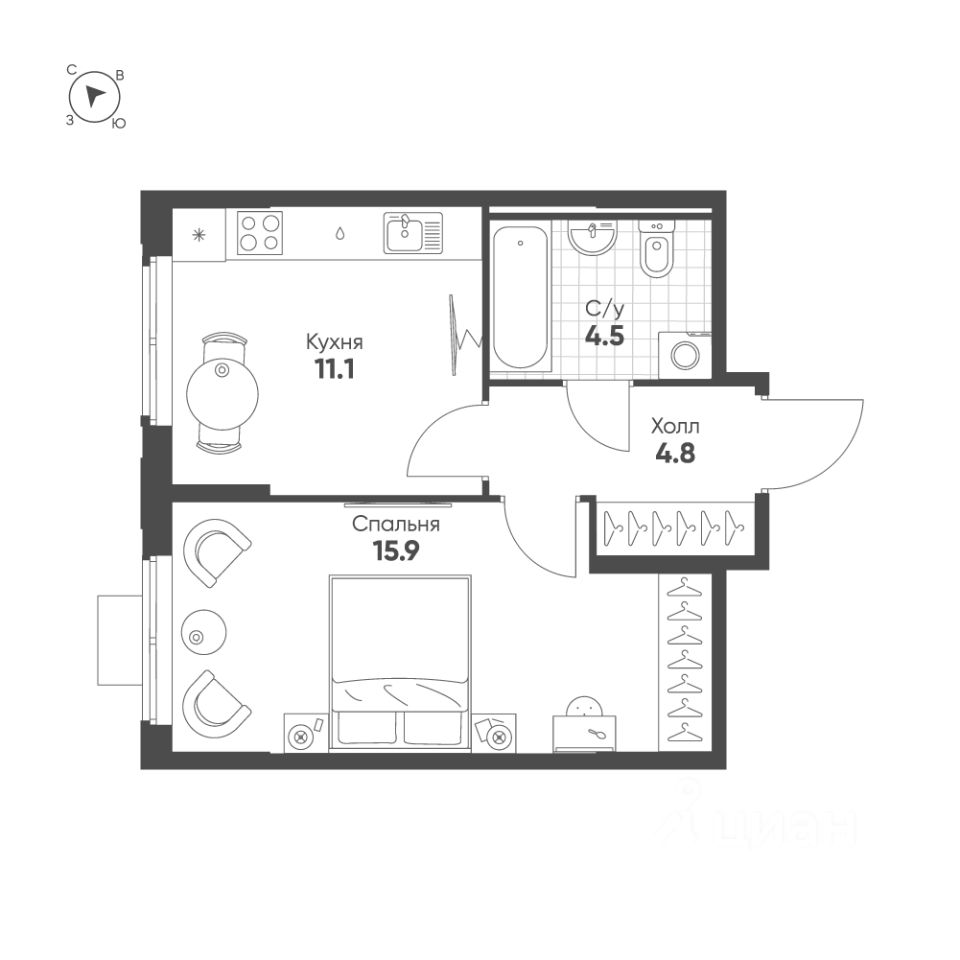 Продается квартира 418, по адресу Ленинградская область, Всеволожский муниципальный район, Муринское городское поселение,город Мурино, корпус Ягодное Река Парк, 1 очередь, корпус 1.12 в Ягодное Река Парк на 7 этаже, с площадью 36.3 м2.
