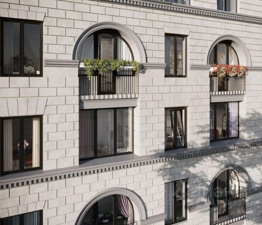 Это малоэтажный дом середины XX в. с неоклассической архитектурой — рустованным фасадом, арочными окнами и французскими балконами в самом сердце Выборгского района на Зеленогорской улице 3.