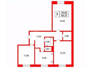 - три комнаты: 15,5 кв. м, 11,9 кв. м и 13,2 кв. м;