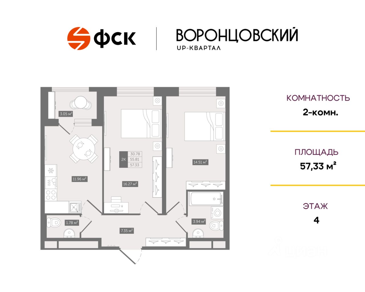 Цена со скидкой до 30% в прямой продаже от застройщика — только в этом месяце. Беспроцентная рассрочка. 2-к квартира в ЖК UP-квартал "Воронцовский" на 4-м этаже. Общая площадь 57,33. Без отделки.