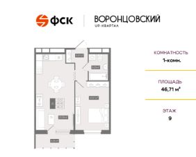 Цена со скидкой до 30% в прямой продаже от застройщика — только в этом месяце. Беспроцентная рассрочка. 1-к квартира в ЖК UP-квартал "Воронцовский" на 9-м этаже. Общая площадь 46,71. Чистовая отделка.