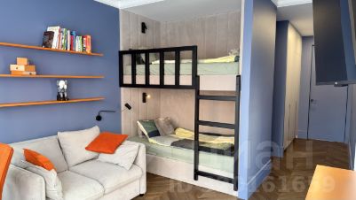 детская мастер спальня с зоной гардеробной, своим санузлом, двухъярусной кроватью взрослого размера с мягкими стеновыми панелями, и рабочей зоной на 2 человека. Дополнительные 2 спальные места в виде дивана для друзей или бабушек. Окна выходят во внутренний двор с детской площадкой.