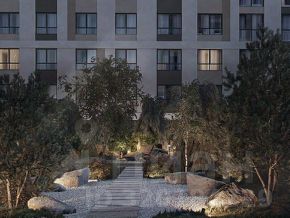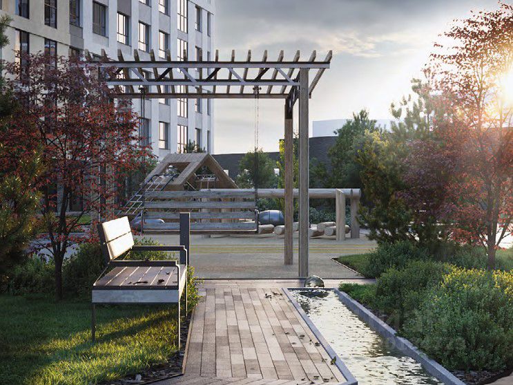- на стилобате расположится приватный и охраняемый внутренний двор с очень богатым наполнением: детские, игровые и спортивные площадки, пейзажный парк с ручьем, беседки и шезлонги, арт-объекты и огромное количество кустарников и деревьев