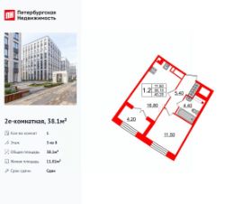 Удобная, классическая, функциональная европланировка, большая кухня-гостиная 16.9 м², просторная прихожая 5.4 м². Общая площадь квартиры - 38.1 м², жилая 11.81 м², высота потолка 3 м.