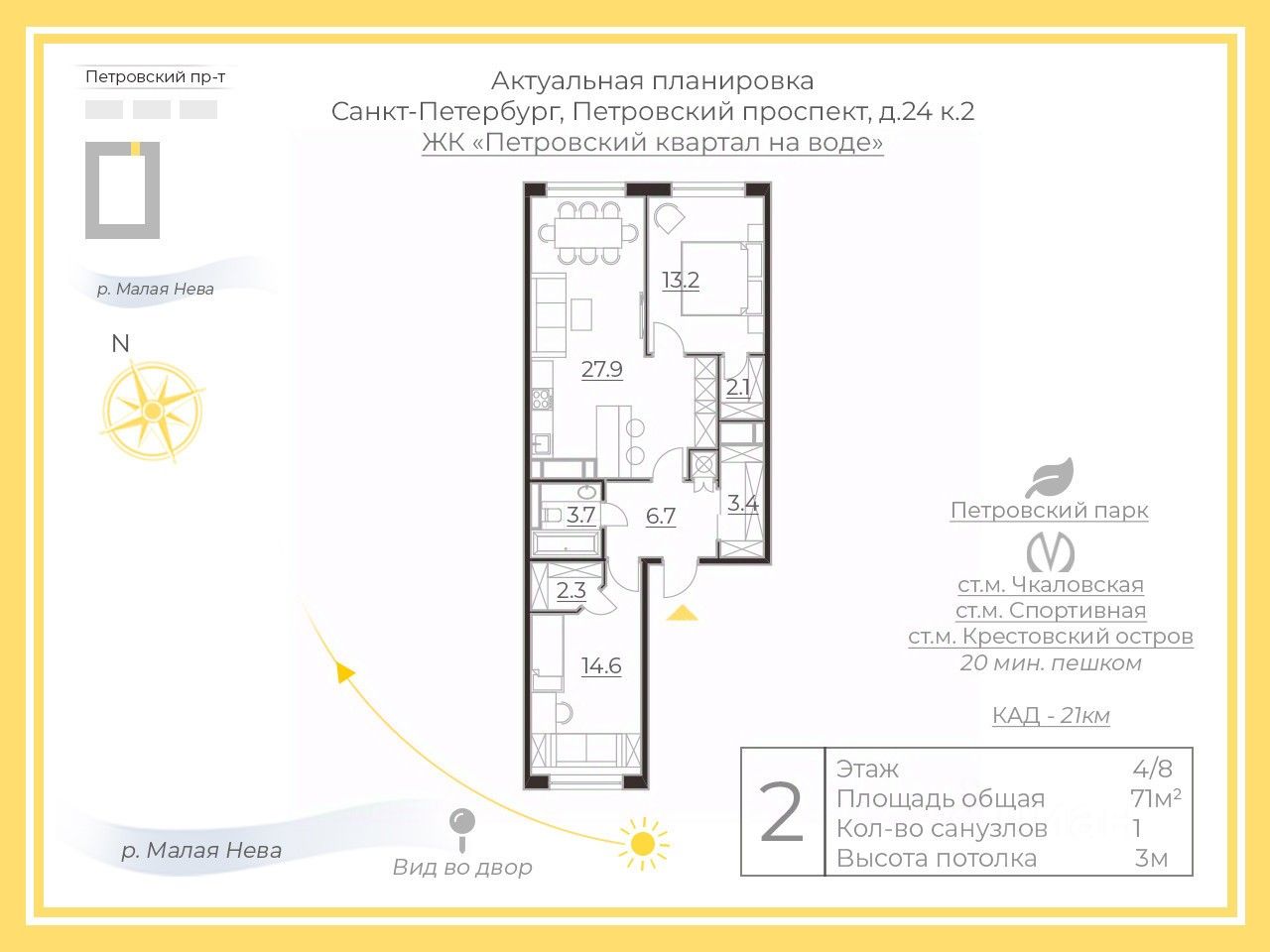 Корпус видовой, находится на первой береговой линии Малой Невы, без коммерции на первых этажах , вдали от петровского проспекта. Благодаря двухстороннему расположению квартиры и панорамным окнам " в пол " здесь всегда много света и воздуха.