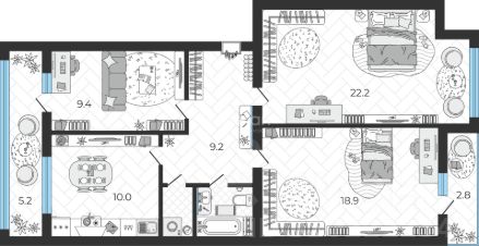 - комнаты 18.9 м², 9,4 м² и просторная гостиная 22,2 м²;
