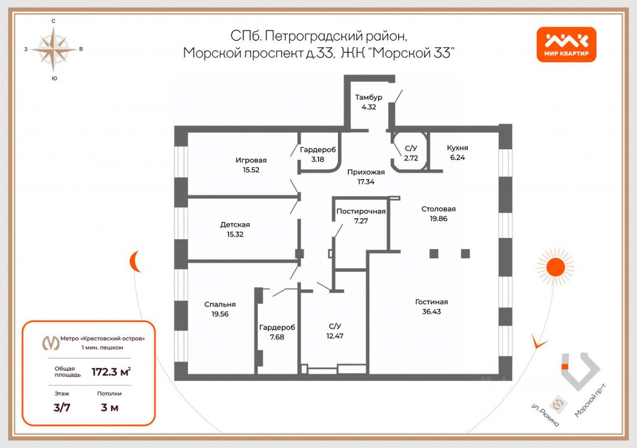 Квартира, площадью 172,3 метра, находится на 3 этаже статусного ЖК на Морском проспекте 33 и включает кухню-столовую, гостиную около 35 м2, две детские по 15 м2, мастер-спальню с гардеробной. В квартире предусмотрено несколько санузлов, большая остеклённая лоджия, постирочная.