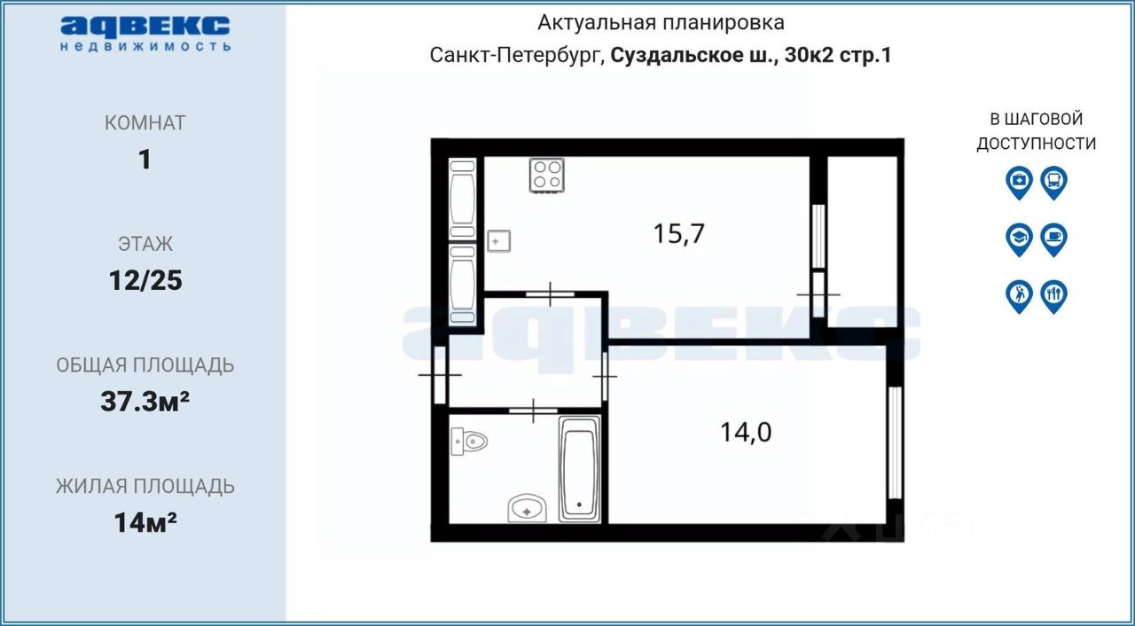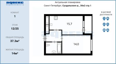 Общая площадь квартиры- 37,3м2, в прихожей есть ниша для гардеробной. Панорамные окна. С/у совмещенный, с полноценной ванной. просторная спальная комната- 14м2 и кухня-гостиная- 15.7м2. Зона кухни выложена плиткой. Ремонт от известного застройщика. Всего 5 квартир на этаже.