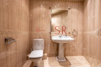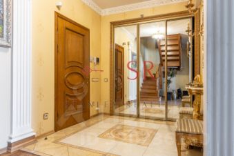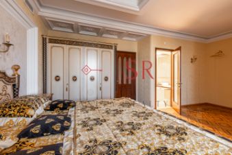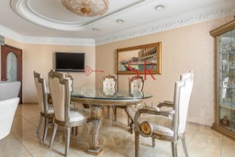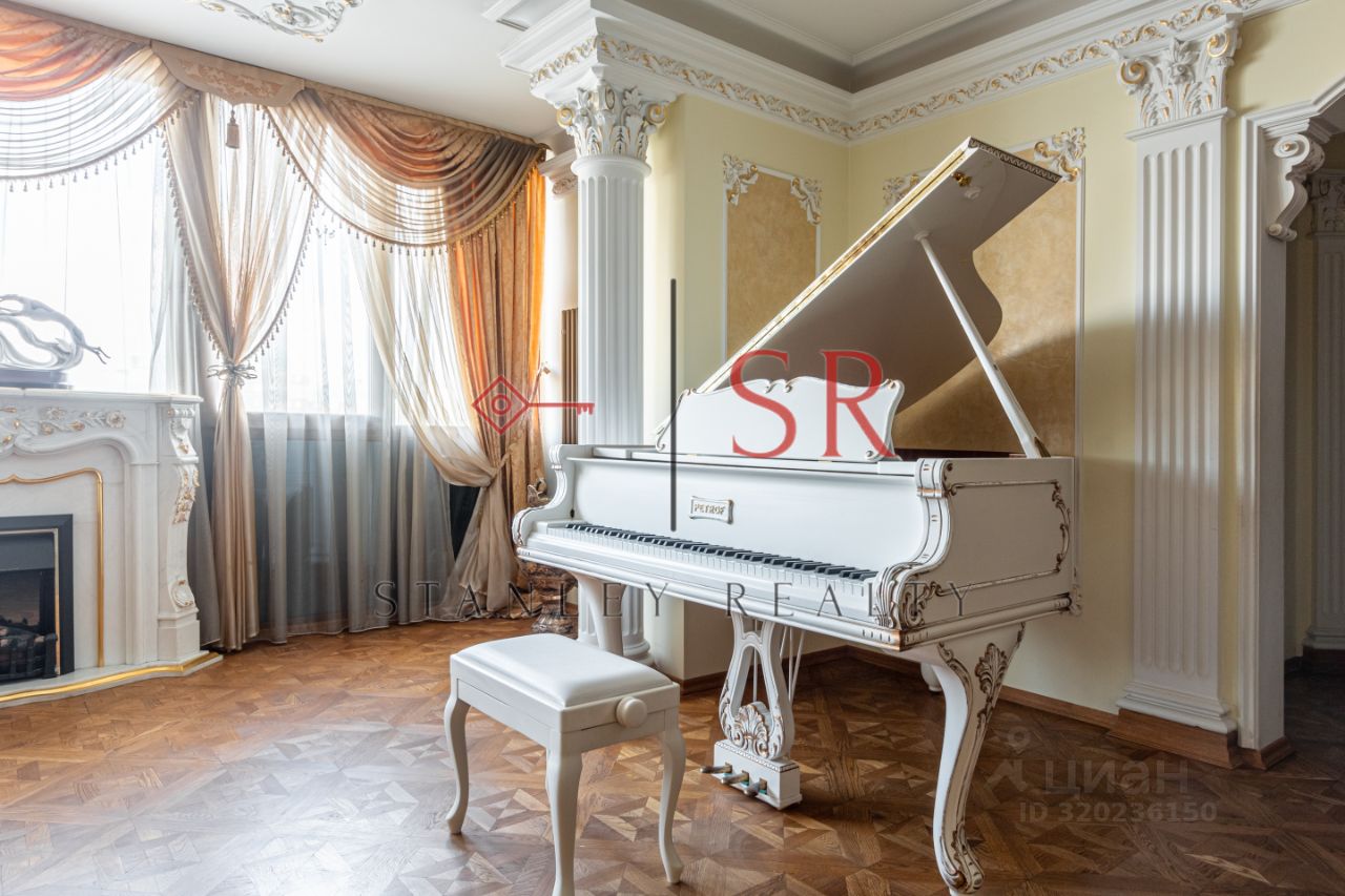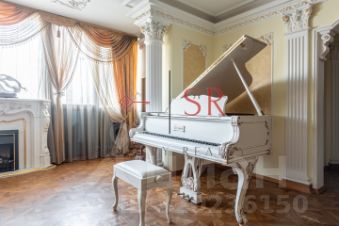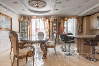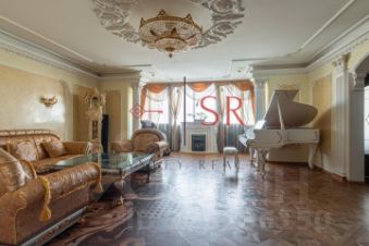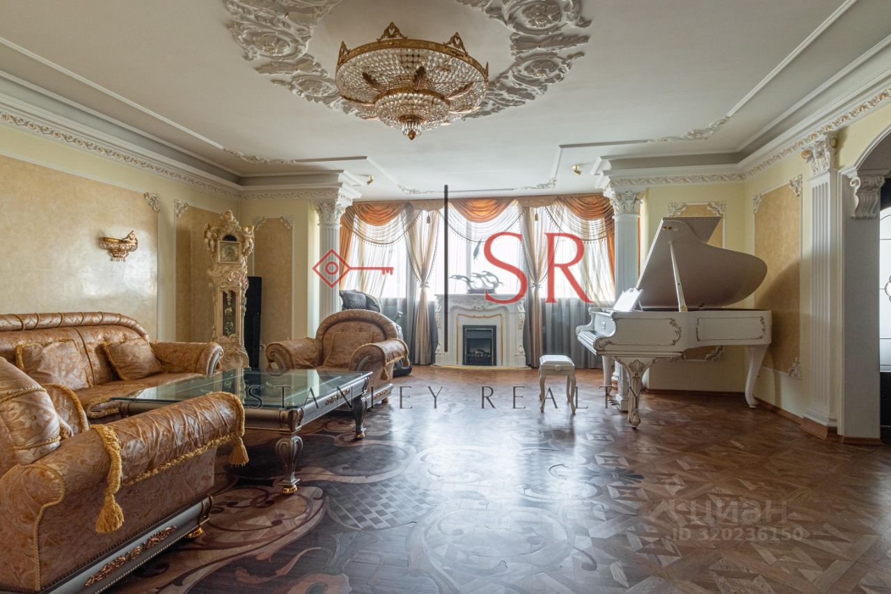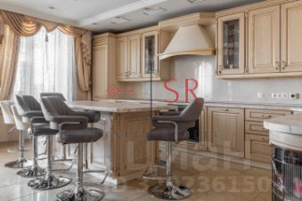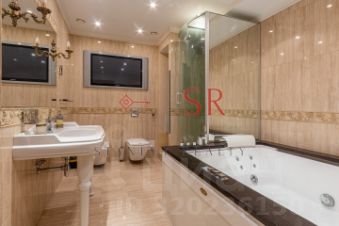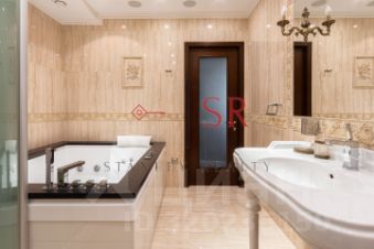 Общая площадь квартиры составляет 334,4 кв. м, жилая площадь — 185 кв. м, а кухня впечатляет своими 37 кв. м.