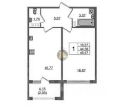 Квартира находится на 3 / 8 этаже. Общая площадь квартиры 46,67 м2. Кухня 16,77 м2. Спальня 16.87 м2. Лоджия 4.18 м2. Санузел: 3.57 м2 + 1.70 м2