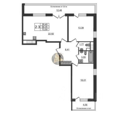 Квартира находится на 7 этаже. Общая площадь квартиры 66,05 м2. Функциональная кухня-гостиная 22,92 м2, с террасой 12,46 м2 и балконом 4,06 м2. Комнаты 13,39 и 16,01 м2. Коридор с местом под шкаф 8,41 м2. Раздельный сан. узел 3,55 и 1,7 м2.