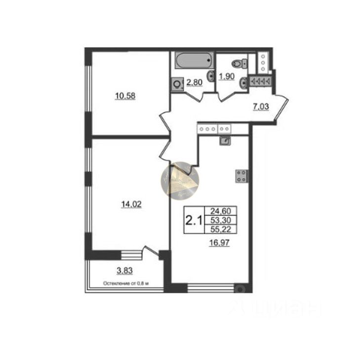 Квартира находится на 9 этаже. Общая площадь квартиры 53,30 м2. Функциональная кухня-гостиная 16,97 м2, балкон 3,83 м2. Комната 14,02, гостиная 10,58 м2 Коридор с местом под шкаф 7,03 м2. Раздельный сан. узел 2,80 и 1,90 м2.