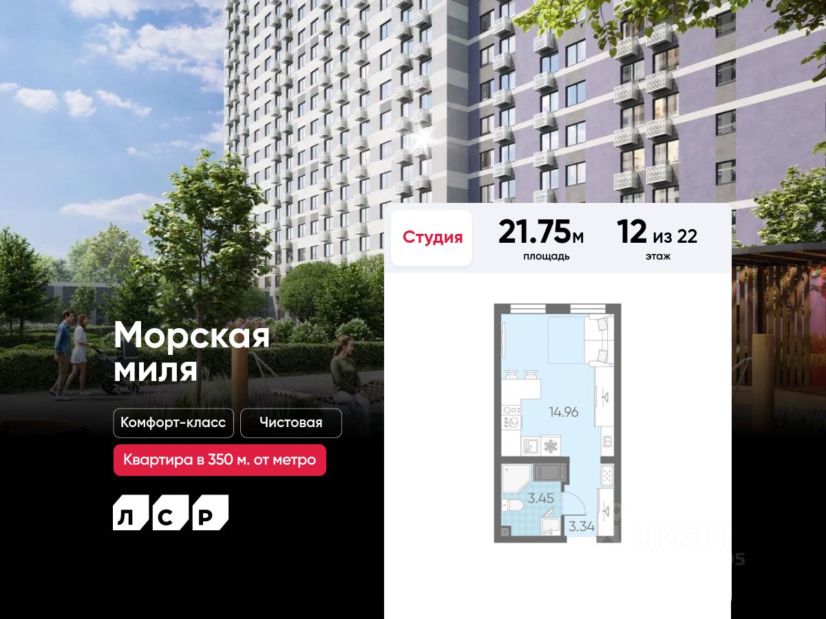 Продается студия в ЖК "Морская миля" на 12 этаже. Общая площадь составляет 21.75 кв. м. Квартира с чистовой отделкой. Жилой комплекс "Морская миля" располагается по адресу Санкт-Петербург, Красносельский. Морская миля - жилой комплекс в Красносельском районе Санкт-Петербурга. Расположение комплекса - его главное преимущество: близость к таким историческим памятникам и местам, как Петергоф, Павловский дворец и Царское село позволяет в любой момент насладиться красотами культурной столицы России. Расположение: - всего 350 м до новой станции метро "Юго-Западная"; - 20 минут до Петергофа на автомобиле; - 20 минут до аэропорта "Пулково" на автомобиле; - 30 минут до Царского села на автомобиле. Между корпусами расположены спортивные и детские площадки, пешеходный бульвар. В квартире выполнена полная отделка "Comfort Wood" из качественных материалов: прочный ламинат цвета благородного дуба, фактурные белые обои, керамическая плитка в ванной. Вход в парадные расположен на уровне земли и создает доступную среду для пожилых людей, людей с ограниченными возможностями и мам с колясками. На этажах и в подвале есть кладовые, которые позволят освободить пространство квартиры от лишних вещей. Первые этажи отведены под магазины и колясочные. На территории комплекса находятся наземные паркинги, гостевые парковки, детский сад, школа. В пешей доступности расположены магазины, кафе, аптеки и прочие удобства, необходимые для спокойной и комфортной жизни. Во дворах устроены пешеходные зоны, дворы озеленены и благоустроены: имеются тенистые аллеи, уютные зоны для отдыха детей и взрослых, а также стильные плей-хабы. Преимущества: - Станция метро в пешей доступности - Пешеходный бульвар - Близость к памятникам культуры и архитектуры - Школа и детский сад во дворе - Доступная среда Успейте приобрести квартиру на выгодных условиях! Чтобы узнать подробности, обращайтесь за консультацией по телефону.