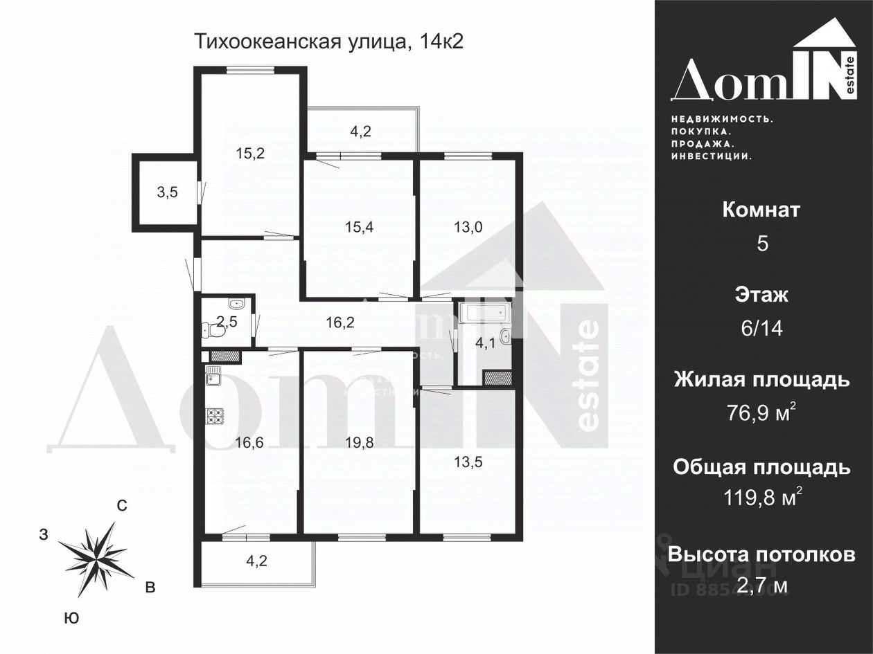 Комнаты: 15,2+15,4+13,0+13,5+19,8м2.