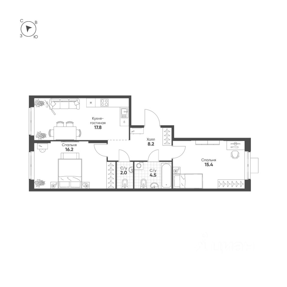 Продается квартира 44, по адресу Ленинградская область, Всеволожский муниципальный район, Муринское городское поселение,город Мурино, корпус Ягодное Река Парк, 1 очередь, корпус 1.12 в Ягодное Река Парк на 12 этаже, с площадью 64.1 м2.