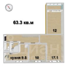 Площадь квартиры 63.3. Кухня 9.5 квадратных метров. Две комнаты раздельные, 12 и 10 кв. м. и проходная 17.1. Лоджия 3.4 кв. м. Сан. узел раздельный. Состояние ремонта полностью соответствует фотографиям. В квартире остаётся кухонный гарнитур, холодильник, ст. машинка, диван. Детская стенка в подарок)