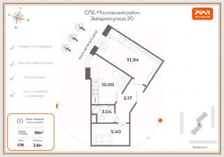 Общая площадь квартиры составляет 38 м². Комнаты правильной формы, кухня площадью 10 м².