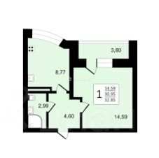 Общая площадь квартиры составляет 32,9 кв. м, из которых 14,6 кв. м — жилая площадь, 8,8 кв. м — кухня. В квартире есть косметический ремонт, окна выходят во двор, а также имеется одна лоджия. Совмещённый санузел обеспечивает удобство и функциональность.