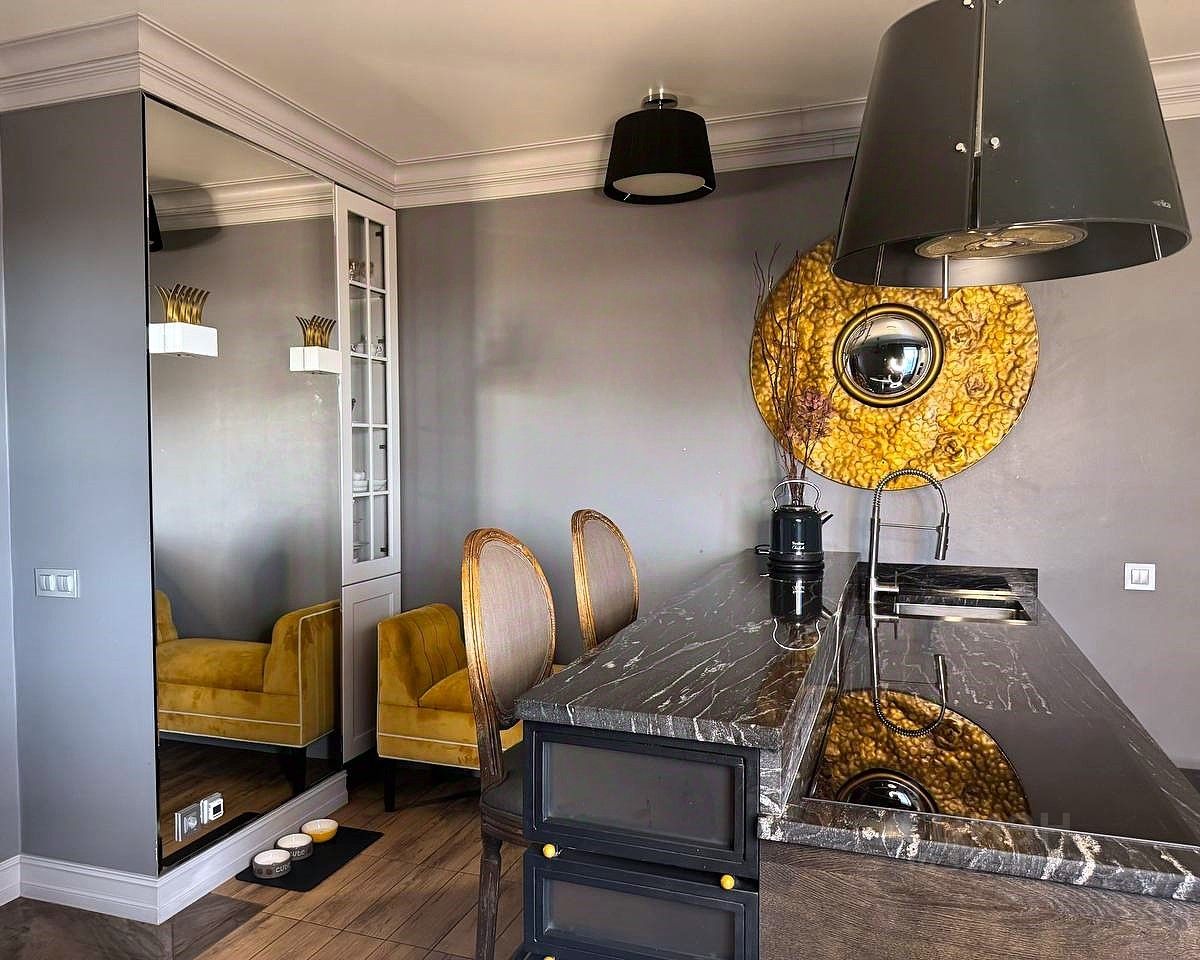 Были выполнены работы: заменены стояки, электрическая проводка, все стены выровнены по уровню, установлены новые батареи Zehnder, тёплый пол в санузле и на кухне, качественные натяжные потолки и огромное количество разноуровневых светильников.