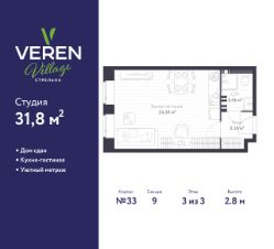 Просторная однокомнатная квартира-студия в ЖК "VEREN VILLAGE Стрельна" на 3 этаже. Квартира без отделки, после получения ключей можно делать ремонт. Общая площадь: 31.8 кв.м., площадь гостиной 24.34 кв.м., из которых 5 кв.м. выделено под кухонную зону. Все окна выходят на одну сторону. В квартире один совмещенный санузел. Высота потолков 2.8 м.