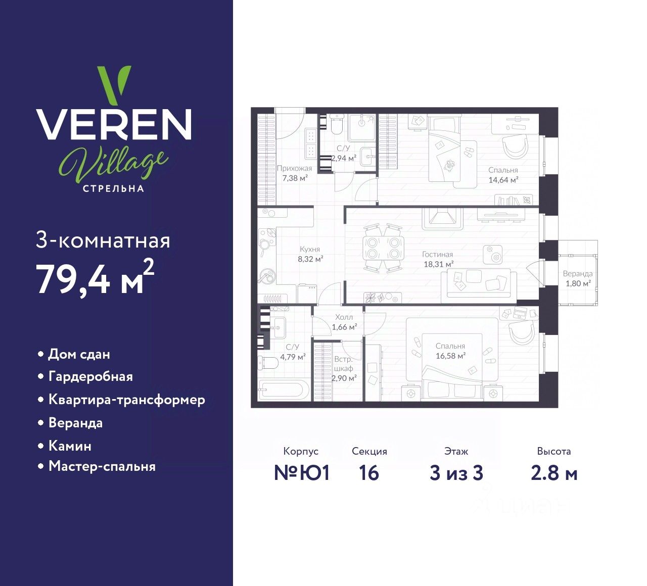 Просторная двухкомнатная квартира в ЖК "VEREN VILLAGE Стрельна" на 3 этаже. Квартира без отделки, после оформления собственности можно делать ремонт. Общая площадь: 79.4 кв.м., жилая: 31.22 кв.м., площадь просторной куxни-гостиной: 26.63 кв.м. Комнаты изолированные, все окна выходят на одну сторону. В квартире один балкон, два совмещенных санузла. Высота потолков 2.8 м.