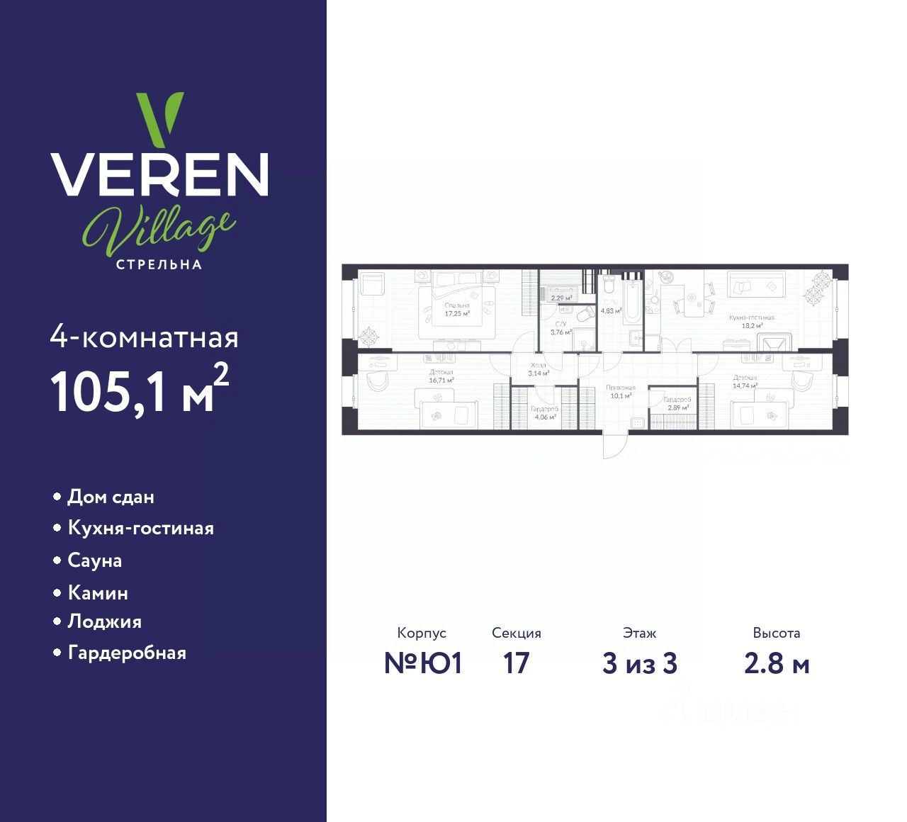 Продается 3-комн. квартира в ЖК "VEREN VILLAGE Стрельна" на 3 этаже. Квартира без отделки, после выдачи ключей можно делать ремонт. Общая площадь: 105.1 кв.м., жилая: 48.7 кв.м., площадь просторной куxни-гостиной: 18.2 кв.м. Квартира - распашонка, без проходных комнат, окна выходят на paзные стороны дома. В квартире два совмещенных санузла. Высота потолков 2.8 м.