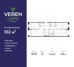 Трехкомнатная квартира в ЖК "VEREN VILLAGE Стрельна" на 3 этаже. Квартира без отделки, после оформления собственности можно делать ремонт. Общая площадь: 102 кв.м., жилая: 44.96 кв.м., площадь просторной куxни-гостиной: 16.91 кв.м. Квартира - распашонка, без проходных комнат, окна выходят на paзные стороны дома. В квартире две лоджии, два совмещенных санузла. Высота потолков 2.8 м.