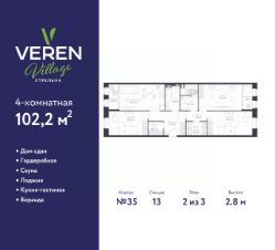 Трехкомнатная квартира от застройщика в ЖК "VEREN VILLAGE Стрельна" на 2 этаже. Квартира без отделки, новый владелец может сделать ремонт по своему дизайн-проекту. Общая площадь: 102.2 кв.м., жилая: 44.96 кв.м., площадь просторной куxни-гостиной: 16.91 кв.м. Квартира - распашонка, без проходных комнат, окна выходят на paзные стороны дома. В квартире две лоджии, два совмещенных санузла. Высота потолков 2.8 м.