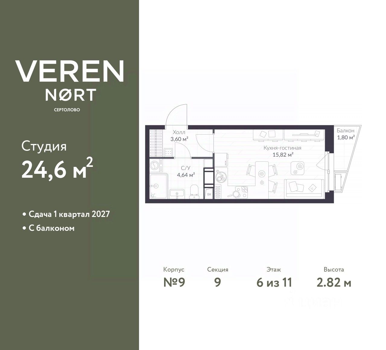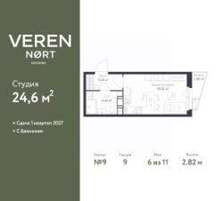 Однокомнатная квартира-студия в Veren Nort Сертолово на 6 этаже. Квартира без отделки, полностью готова к чистовой отделке и дальнейшему ремонту. Общая площадь: 24.6 кв.м., площадь гостиной 15.82 кв.м., из которых 5 кв.м. выделено под кухонную зону. Все окна выходят на одну сторону. В квартире один балкон, один совмещенный санузел. Высота потолков 2.82 м.