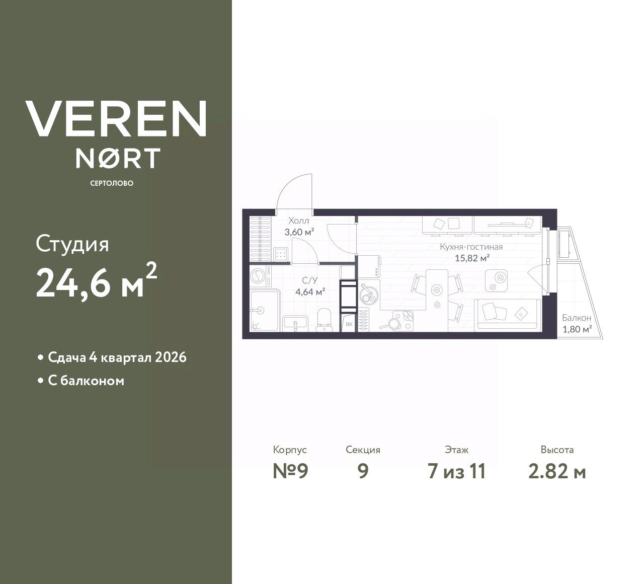 Продается однокомнатная квартира-студия в Veren Nort Сертолово на 7 этаже. Квартира без отделки, новый собственник может сделать ремонт по своему дизайн-проекту. Общая площадь: 24.6 кв.м., площадь гостиной 15.82 кв.м., из которых 5 кв.м. выделено под кухонную зону. Все окна выходят на одну сторону. В квартире один балкон, один совмещенный санузел. Высота потолков 2.82 м.