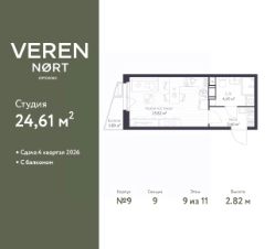 Просторная 1-комн. квартира-студия в Veren Nort Сертолово на 9 этаже. Квартира без отделки, после выдачи ключей можно делать ремонт. Общая площадь: 24.61 кв.м., площадь гостиной 15.82 кв.м., из которых 5 кв.м. выделено под кухонную зону. Все окна выходят на одну сторону. В квартире один балкон, один совмещенный санузел. Высота потолков 2.82 м.