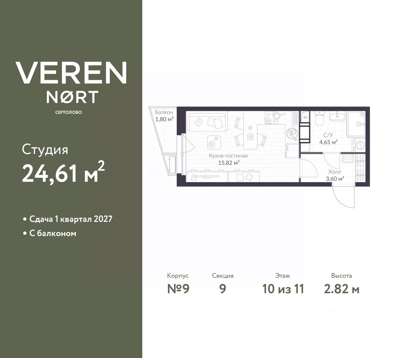Просторная 1-комн. квартира-студия в Veren Nort Сертолово на 10 этаже. Квартира без отделки, новый владелец может сделать ремонт по своему проекту. Общая площадь: 24.61 кв.м., площадь гостиной 15.82 кв.м., из которых 5 кв.м. выделено под кухонную зону. Все окна выходят на одну сторону. В квартире один балкон, один совмещенный санузел. Высота потолков 2.82 м.