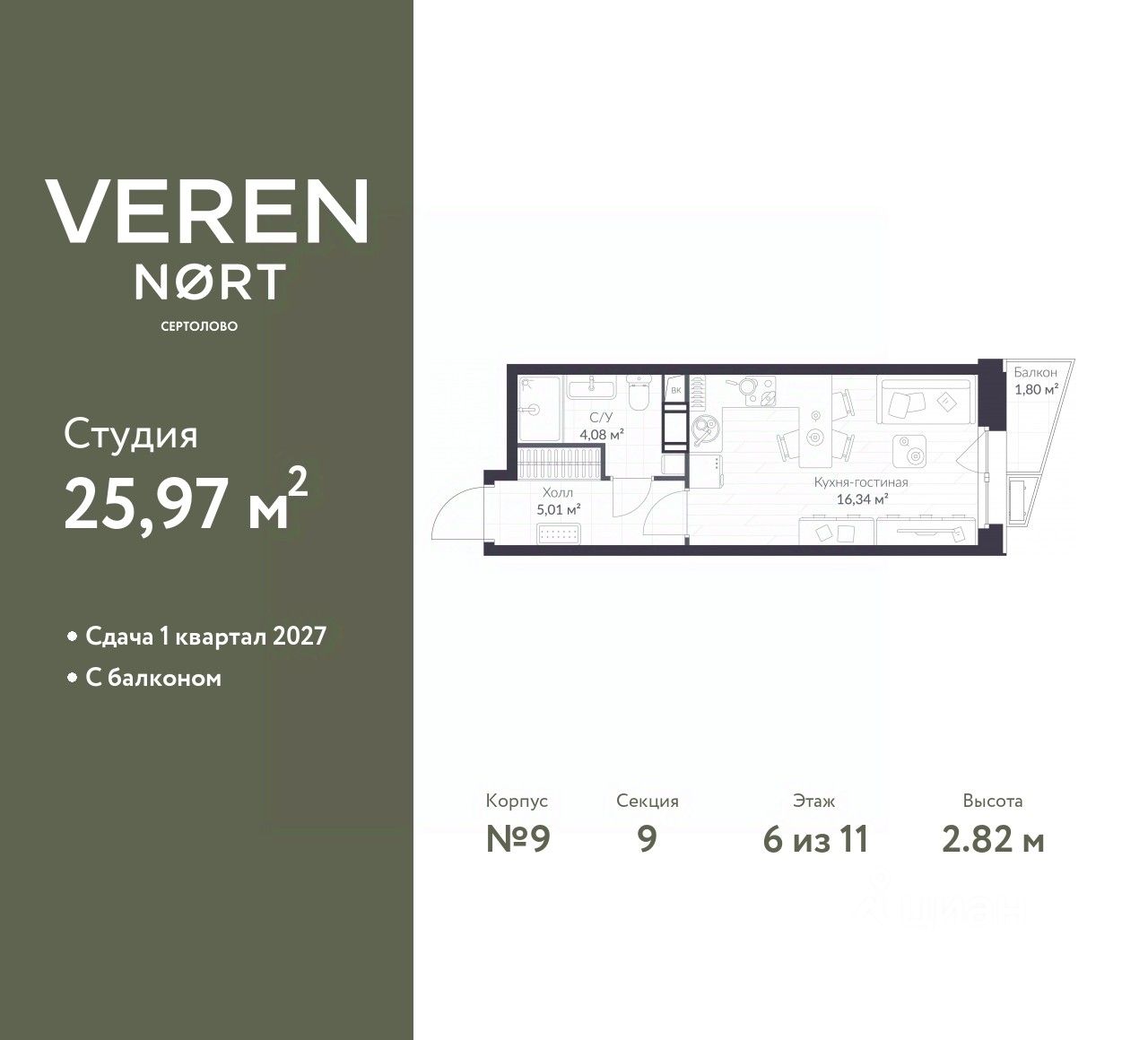 1-комн. квартира-студия в Veren Nort Сертолово на 6 этаже. Квартира без отделки, полностью готова к ремонту. Общая площадь: 25.97 кв.м., площадь гостиной 16.34 кв.м., из которых 5 кв.м. выделено под кухонную зону. Все окна выходят на одну сторону. В квартире один балкон, один совмещенный санузел. Высота потолков 2.82 м.